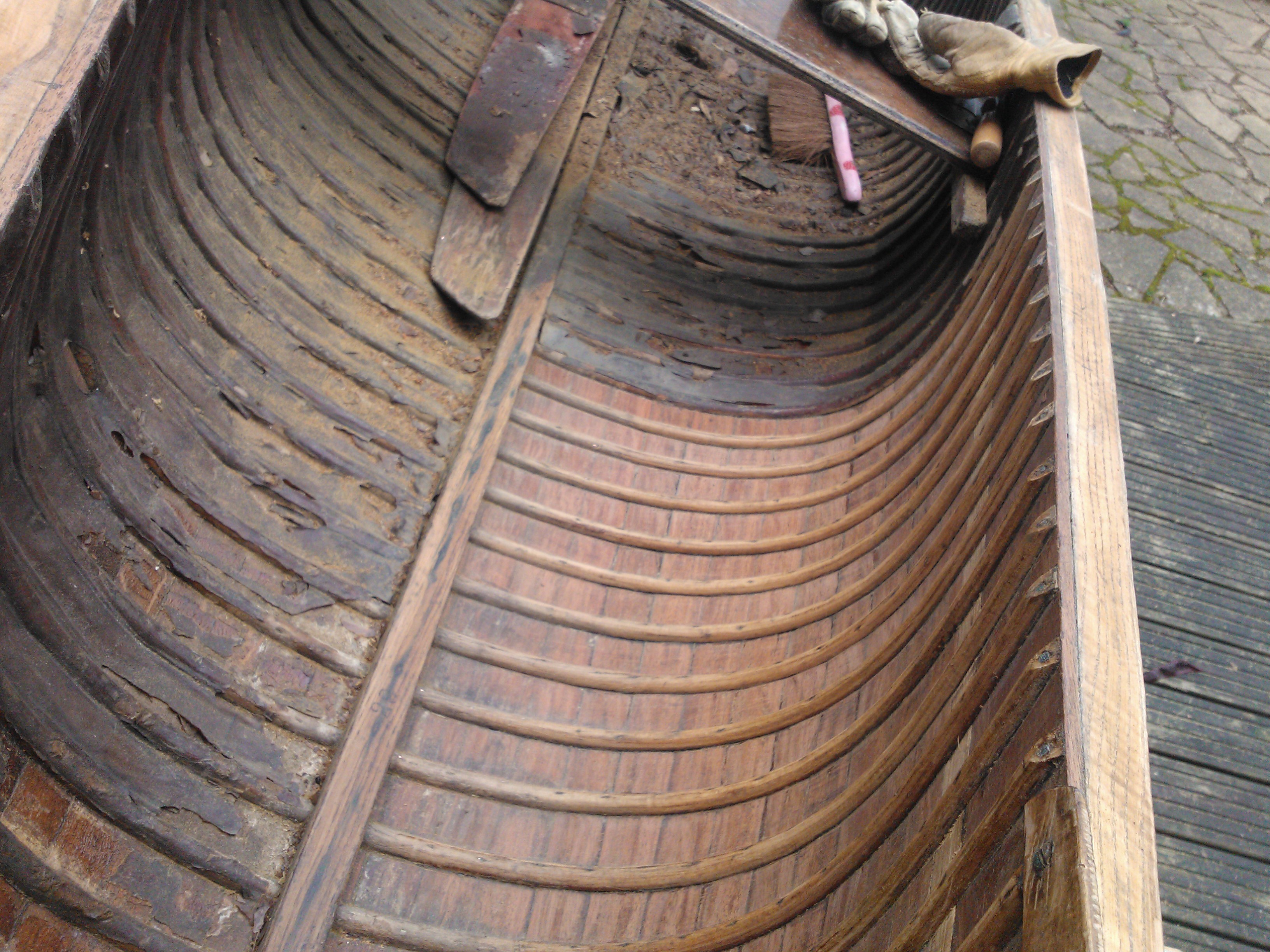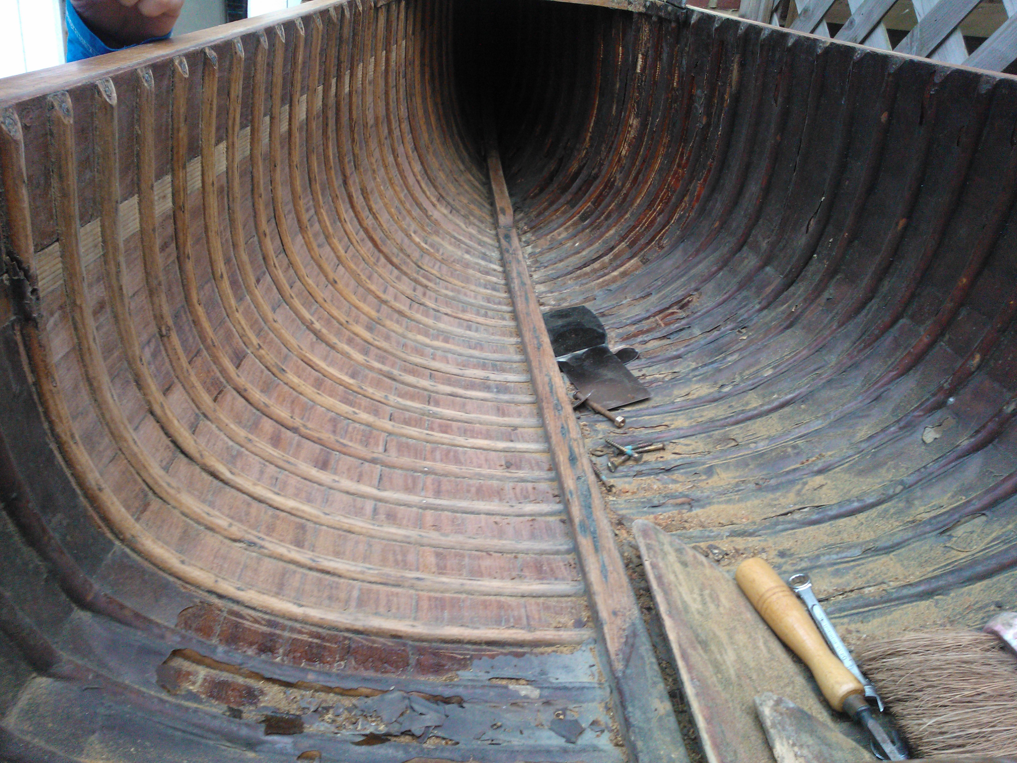 Dry and years of bad varnishing has made the canoe look bad. Having bought a set of cabinet scrapers that are all different shapes, this allows me to get into the nooks and crannies of the boat.